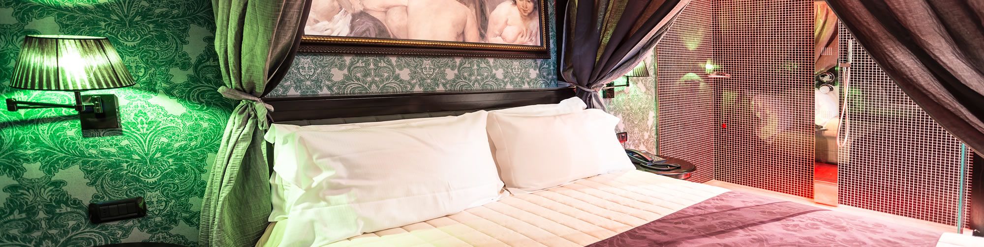 Check-out entro le 12.00. Qualora si volesse prolungare il pernottamento oltre le ore 12.00 (orario di check-out) è previsto un supplemento che vi consentirà di soggiornare fino alle ore 18.00 (previa disponibilità) pari a: € 35,00 per Paradiso Inferno, Yin e Yang, Kamasutra; € 45,00 per Mille e una notte, Luigi XIV, Alcova, Veneziana;€ 55,00 per Geisha, Palestra;€ 65,00 per Sagrestia, Templi, Giochi proibiti; €75,00 per Camera degli specchi, Grande fretello, Harem.